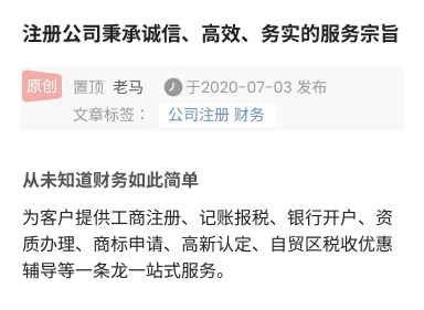 專注于從事財(cái)稅咨詢、財(cái)稅外包、代理記賬等財(cái)稅服務(wù),同時(shí)提供企業(yè)管理咨詢等項(xiàng)目服務(wù)。